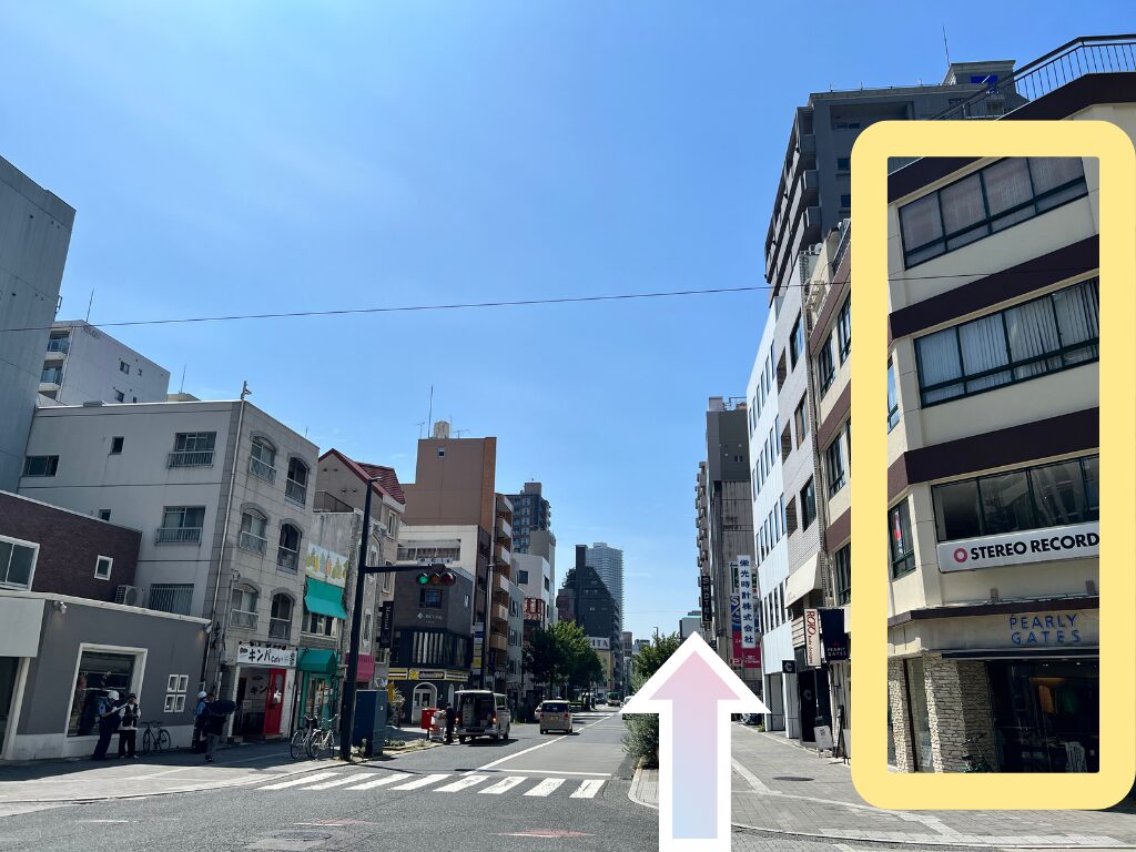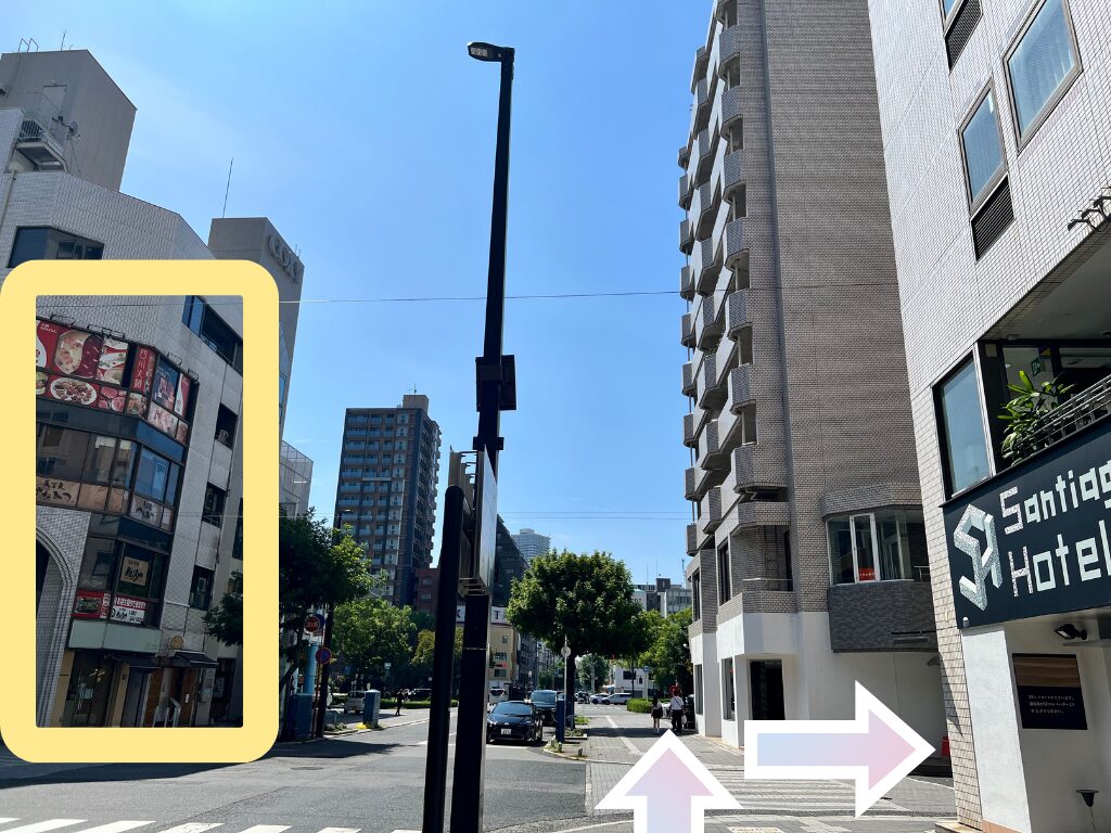 2.『広島パーリーゲイツ』をさらに直進し『かねみつ』の看板が見える建物がある十字路を右折します。