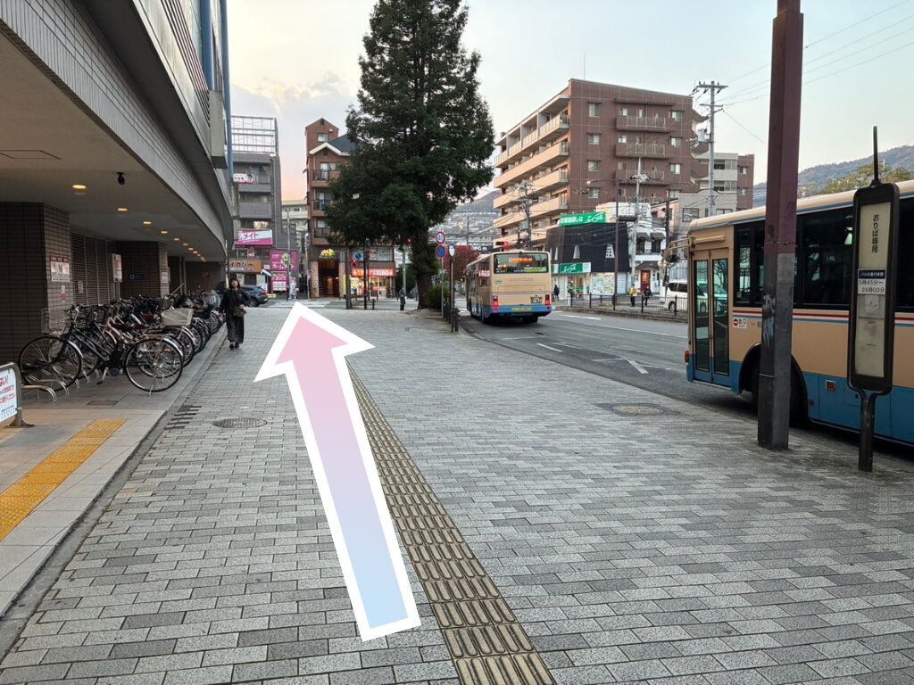 3.出口5を出て左にまっすぐ進み、横断歩道を渡ります(「松のや」さんが目印です!)
