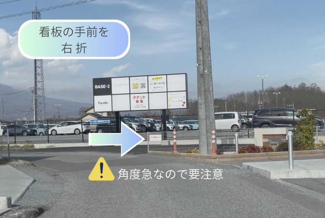 3.突き当たりの看板手前を右折します。※角度が急なので大型車は注意