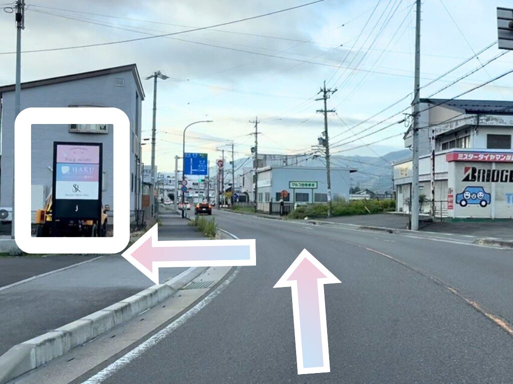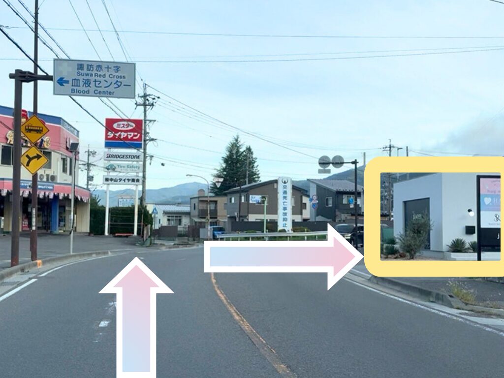 2.「四賀武津」の信号を直進し、約240m進むと右手に当店の建物がございます!正面左から2番目が『HAKU諏訪店』です♪