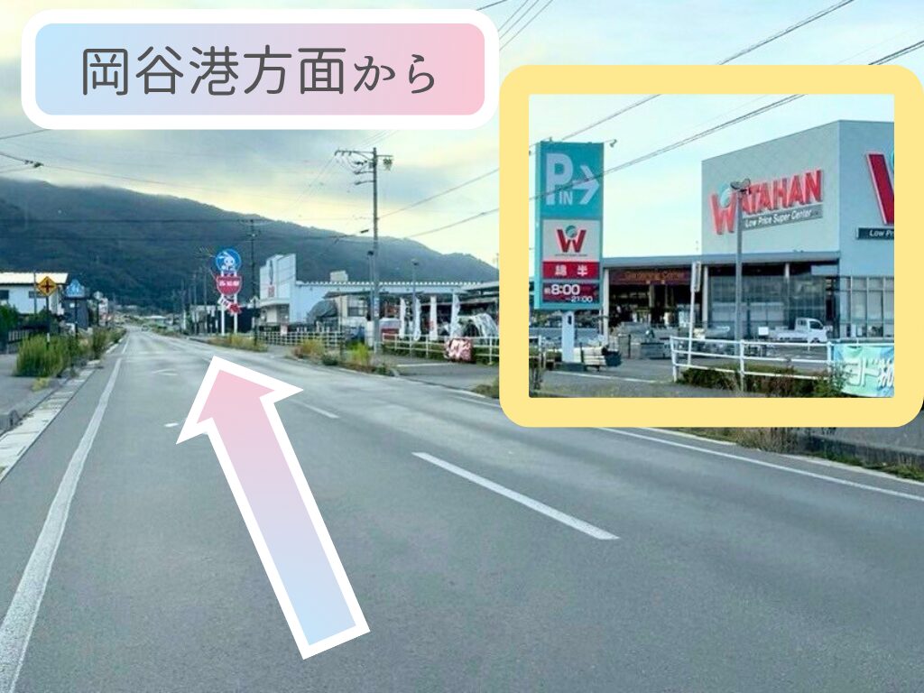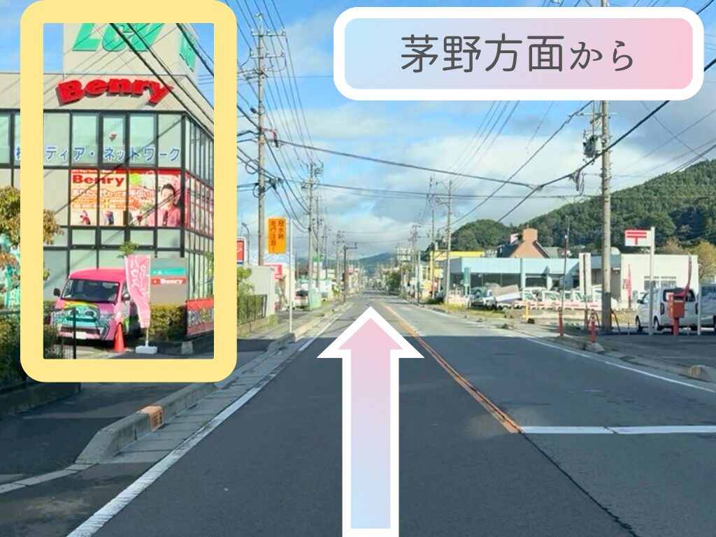 1.綿半から国道20号方面へ約800m直進し、「四賀武津」の信号までお進みください。
