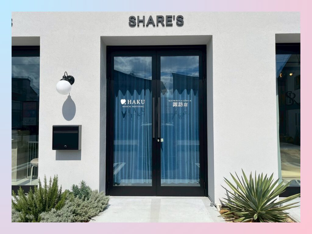 【HAKU諏訪店】を含む建物『SHARE’S』には、トリミングサロン【hug mimi】様、エステサロン【Sero】様、理容室【barber j】様など、魅力あふれるお店がそろっており、美と癒しの空間が広がるモールとなっております。